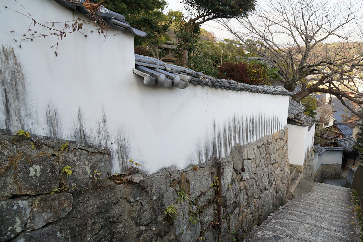 No026 白塀の不思議な模様。おそらく頂部の瓦に付いた埃が雨で流され壁に付いたのだろう。