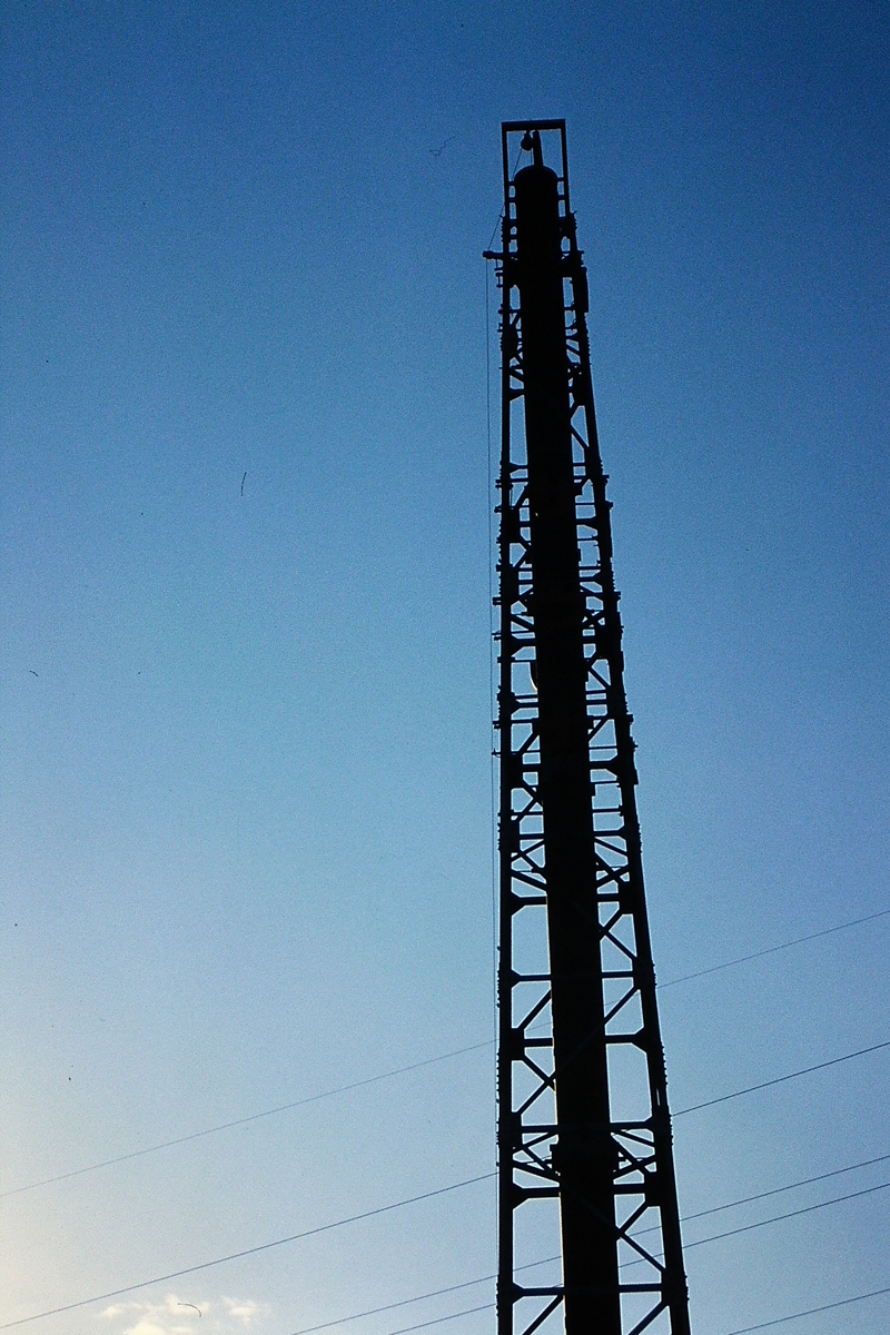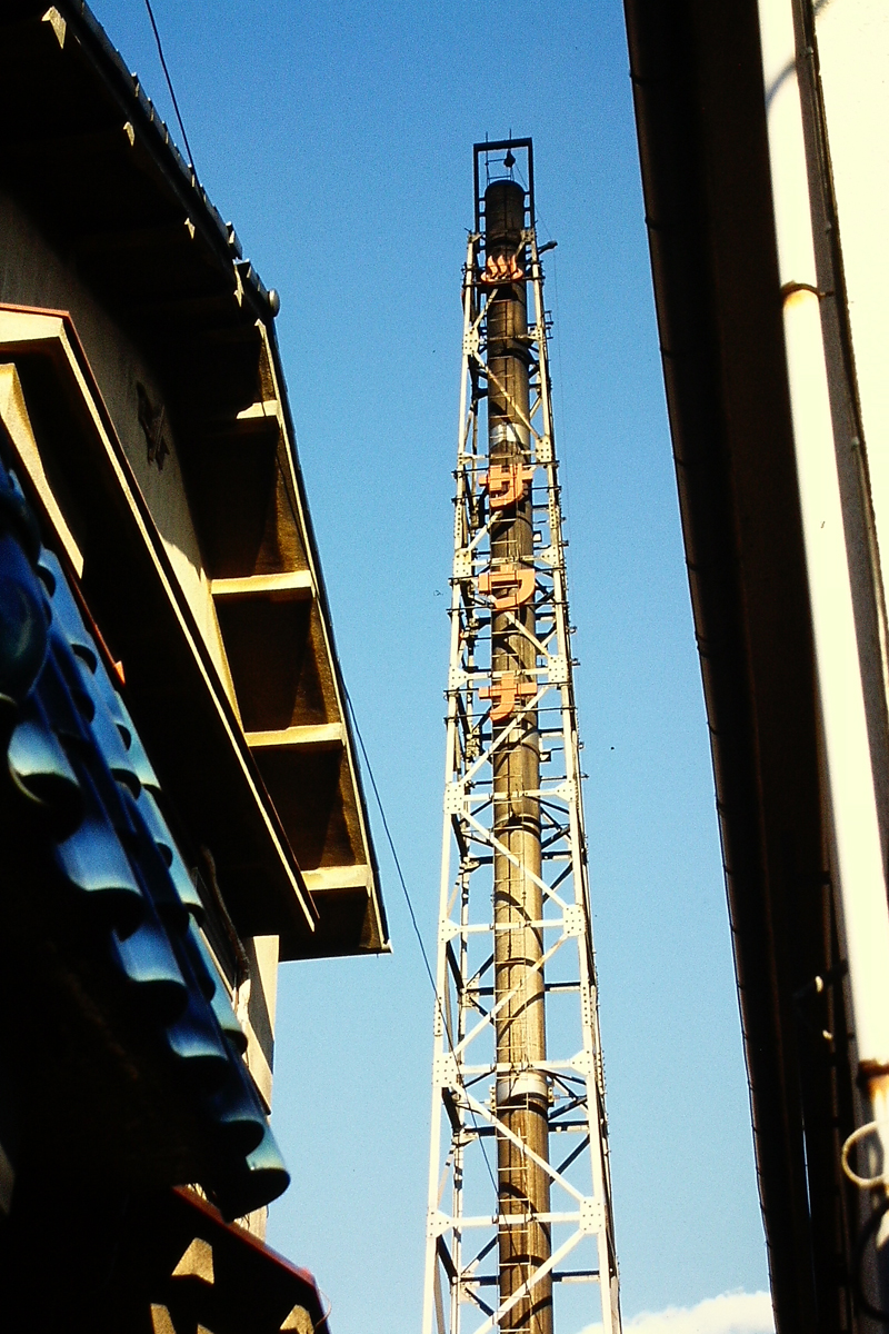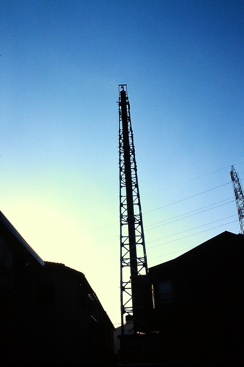 煙突には夕日のシルエットが合っている Photo by Kirihara 1999-01B34