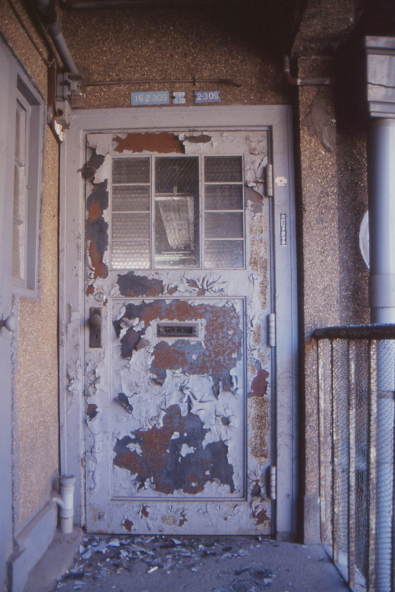 ペンキが剥げ落ちた木製扉に鋼板張りの玄関戸 Photo by Kirihara 1999-02A16