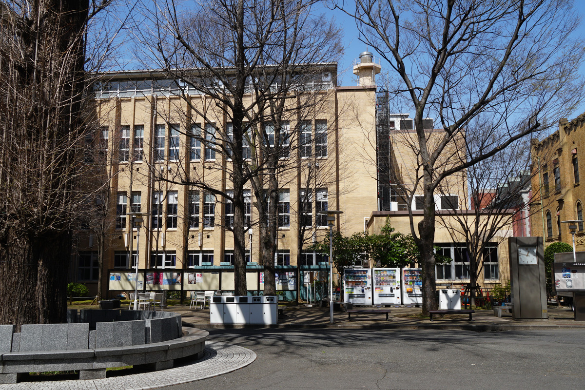 三田キャンパス中央広場から見える1号館と煙突 Photo by Kirihara 2024-0330-2_003