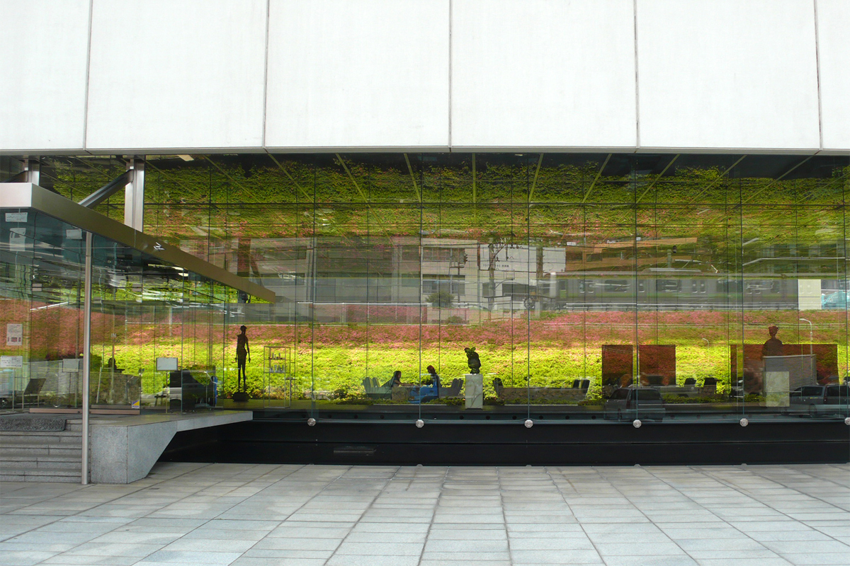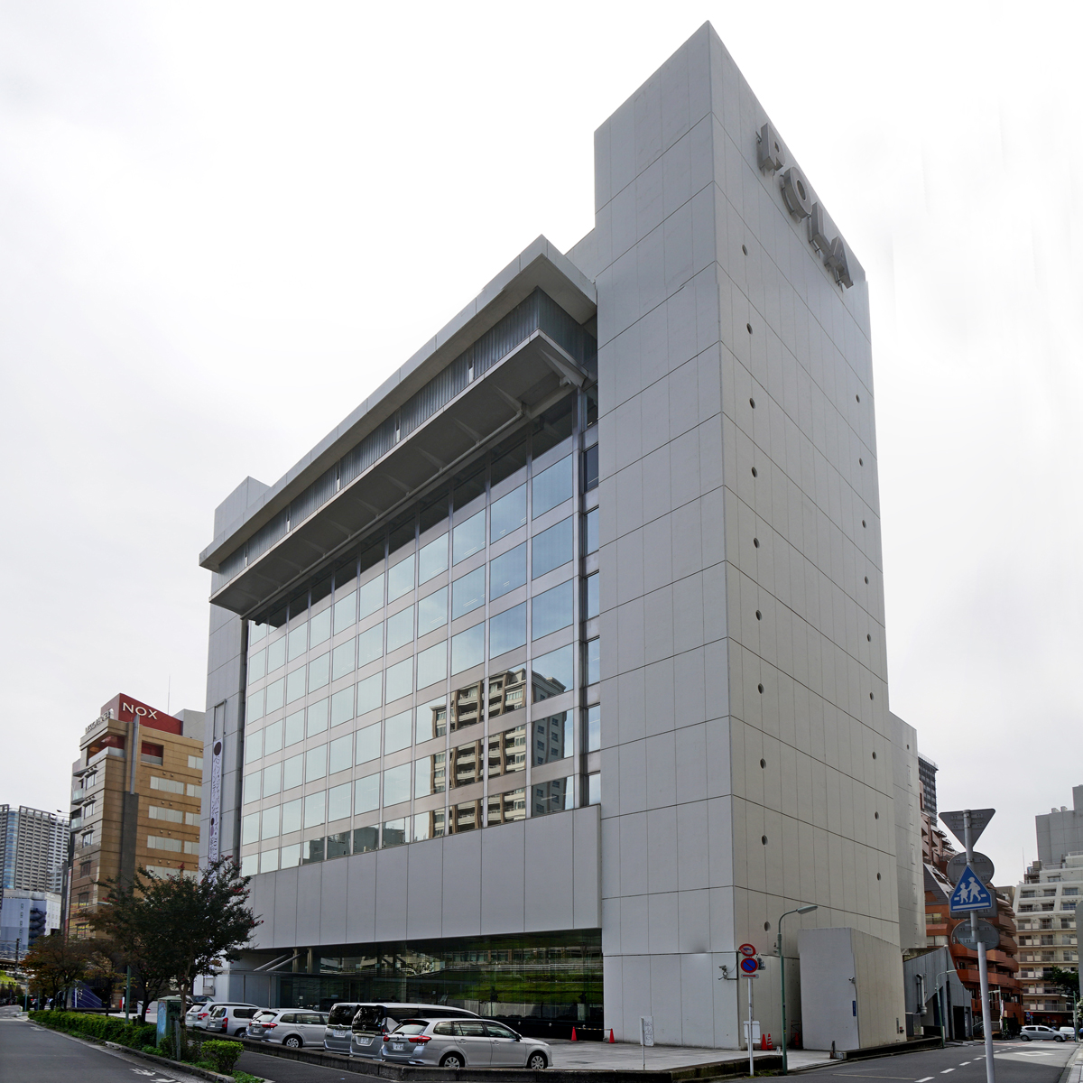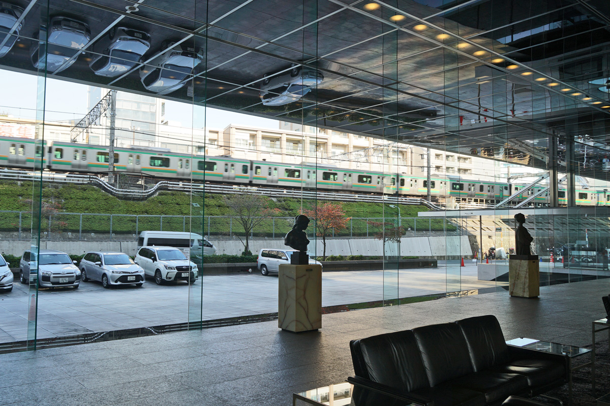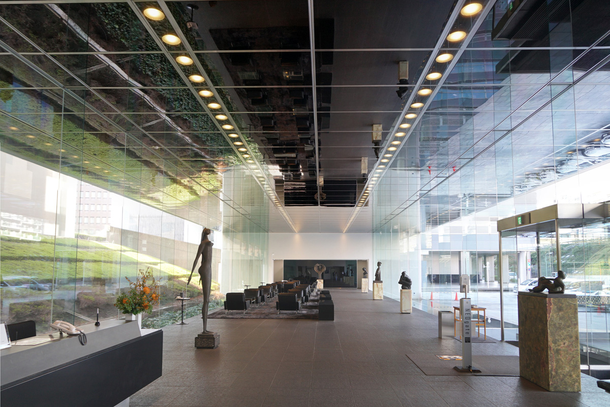 [No175 建築/My Favorite] 両端コアを大梁でつなぎ1階に無柱のロビー空間を作る明快な構成のオフィスビル。山手線の車窓からロビーを通して昇庭が見える構成も秀逸。<設計:日建設計/林昌二 竣工:1971年>分類