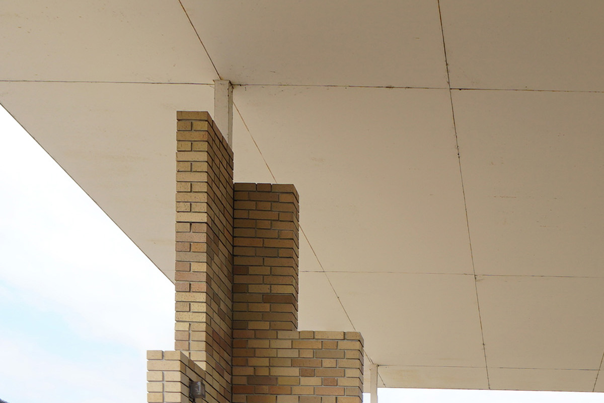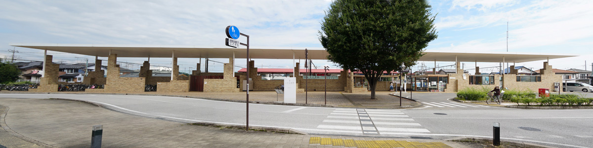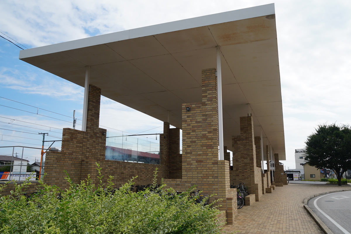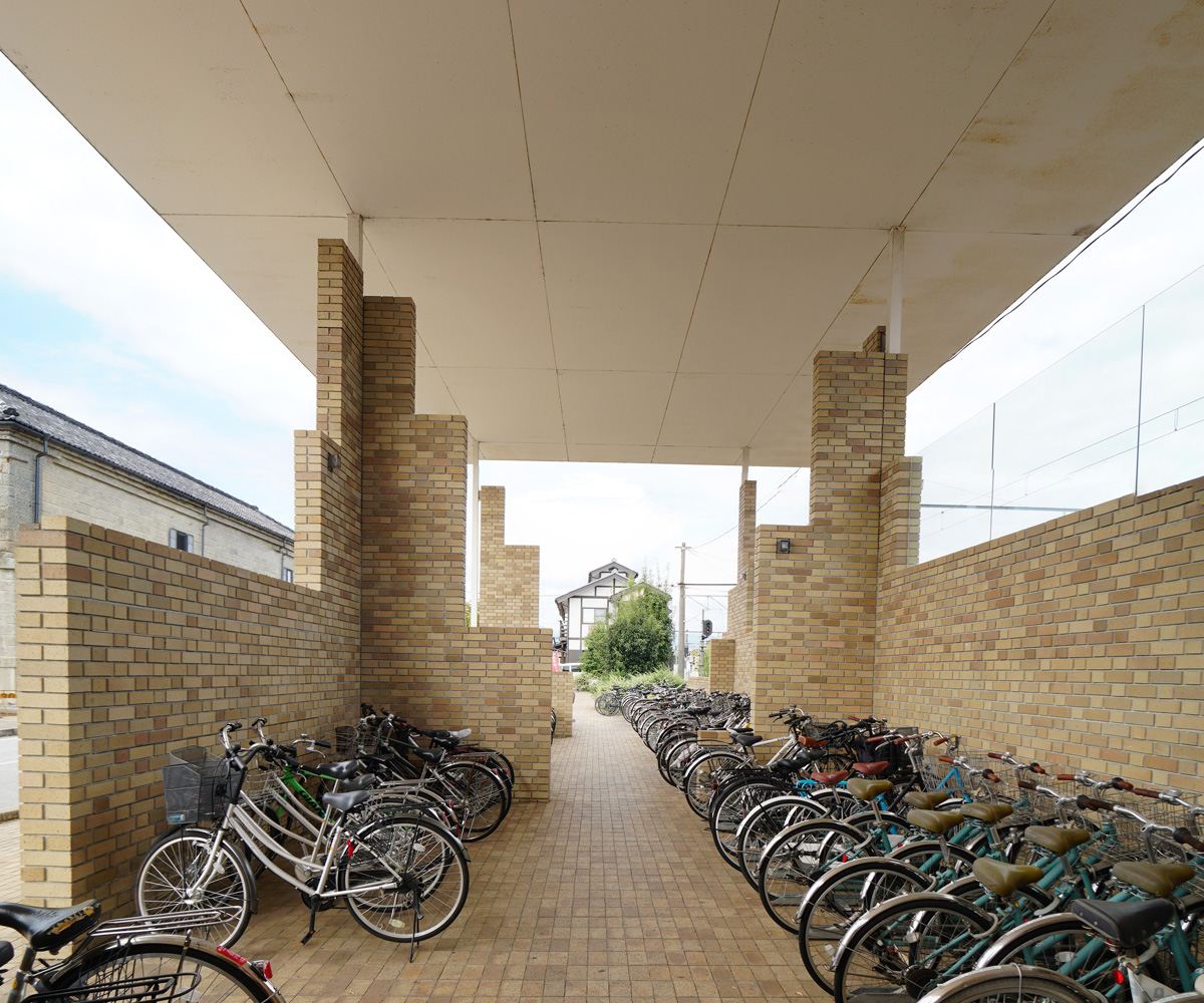 [No181 鉄道/駅舎] 駐輪場も含め駅舎関連の施設が水平に延びる屋根を軽く支えるレンガ壁で統一された軽快な駅舎分類