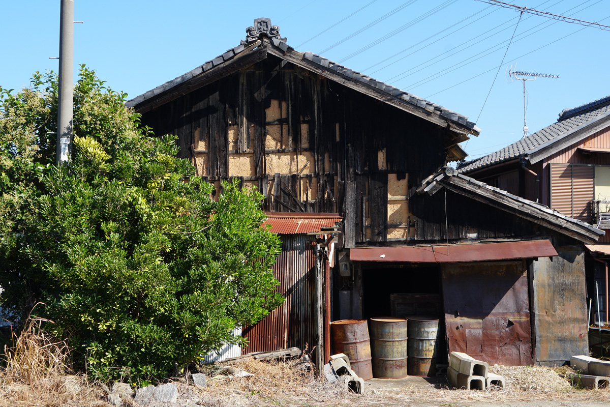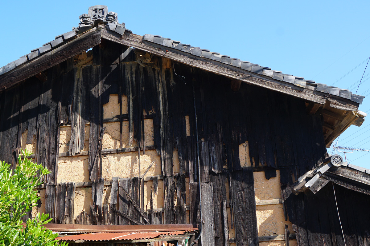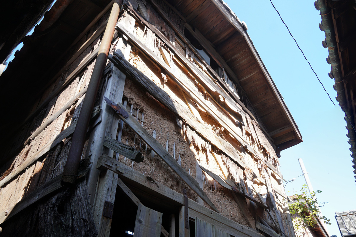 [No203 エイジング/木] 半田市亀崎で見かけた外壁の木板が剥がれ落ち下地の土壁が露出した家屋分類