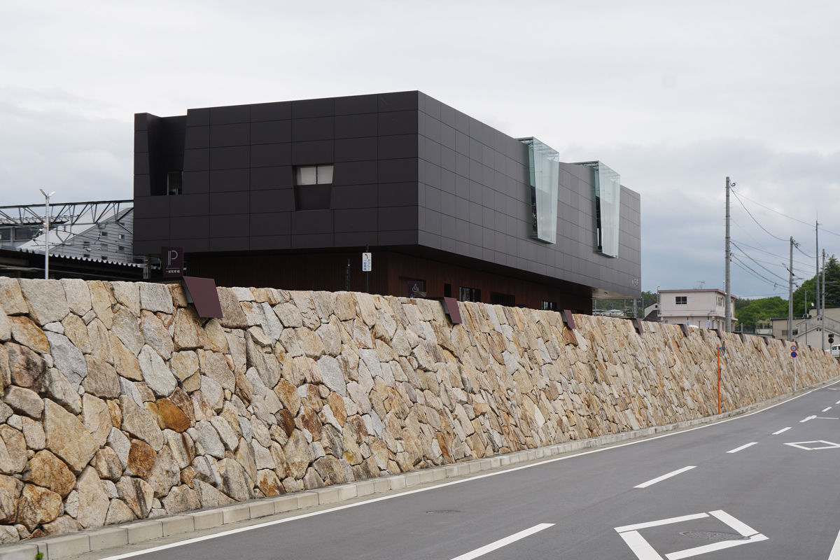 前面道路と駅前広場の段差は小豆島の錆石を鉄筋コンクリート躯体に積んだ「もたれ式擁壁」 Photo by Kirihara 2023-0514-1_061