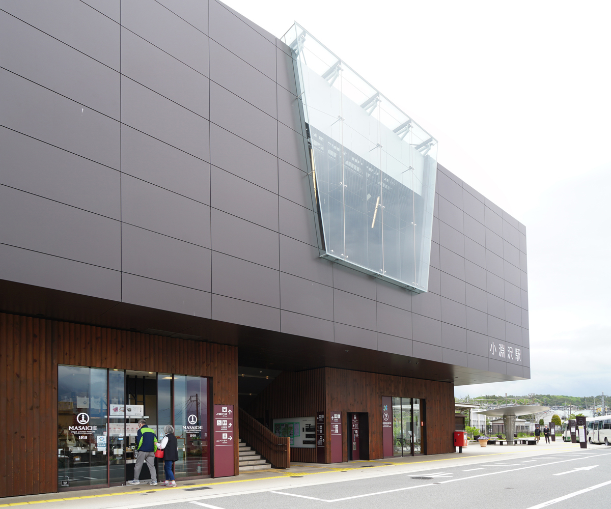[No214 鉄道/駅舎] 北川原温建築都市研究所により設計された小淵沢駅舎・駅前広場。八ヶ岳観光園の玄関口として、地域の素材やイメージが表現されている。
