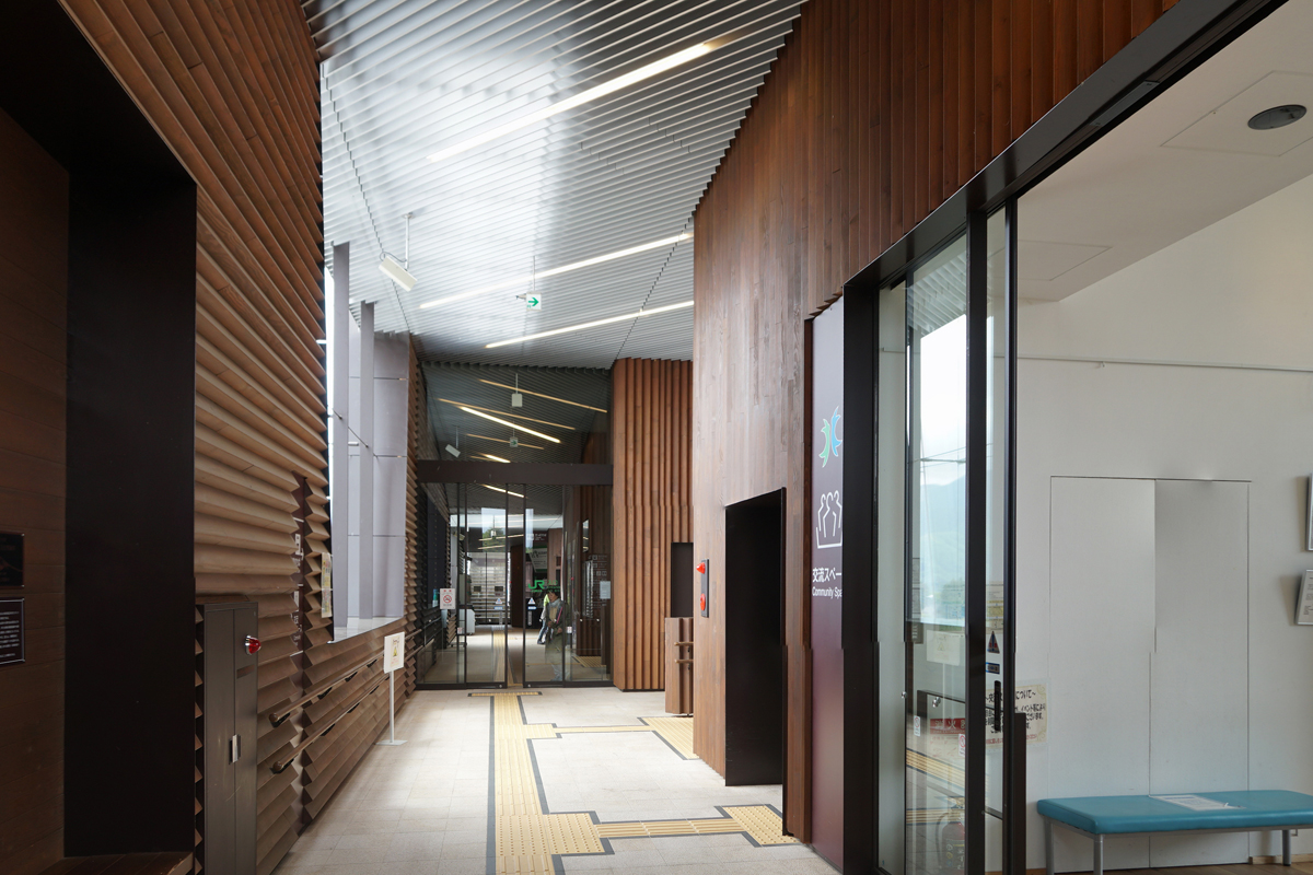 小淵沢一帯に自生するアカマツが使われている2階のコンコース Photo by Kirihara 2023-0514-1_065_panorama