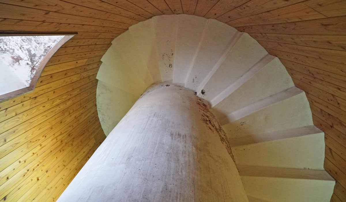 灯台内部のらせん階段。壁面の杉板張りは近年張られたものと思われるが、灯台の迫力がなくなり残念 Photo by Kirihara 2023-0219_015