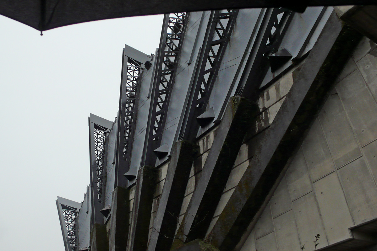 ホールを覆う天蓋を一点から放射状に広がる7本の門型フレームで吊っているダイナミックな外観 Photo by Kirihara 2014-0210-2_045