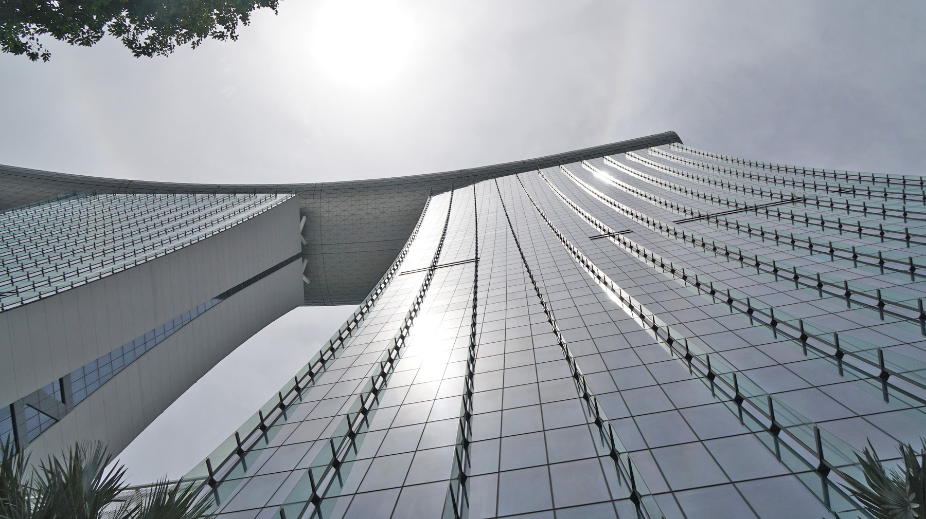 [No338 建築/My Favorite] 設計はモシェ・サフディ。2枚のトランプカードが互いにもたれあう曲線からインスピレーションを得たといわれる3棟の3棟のホテルタワーと、高さ200メートルの屋上を繋ぐ展望デッキとプールはシンガポールの新たなシンボルとなっている。分類