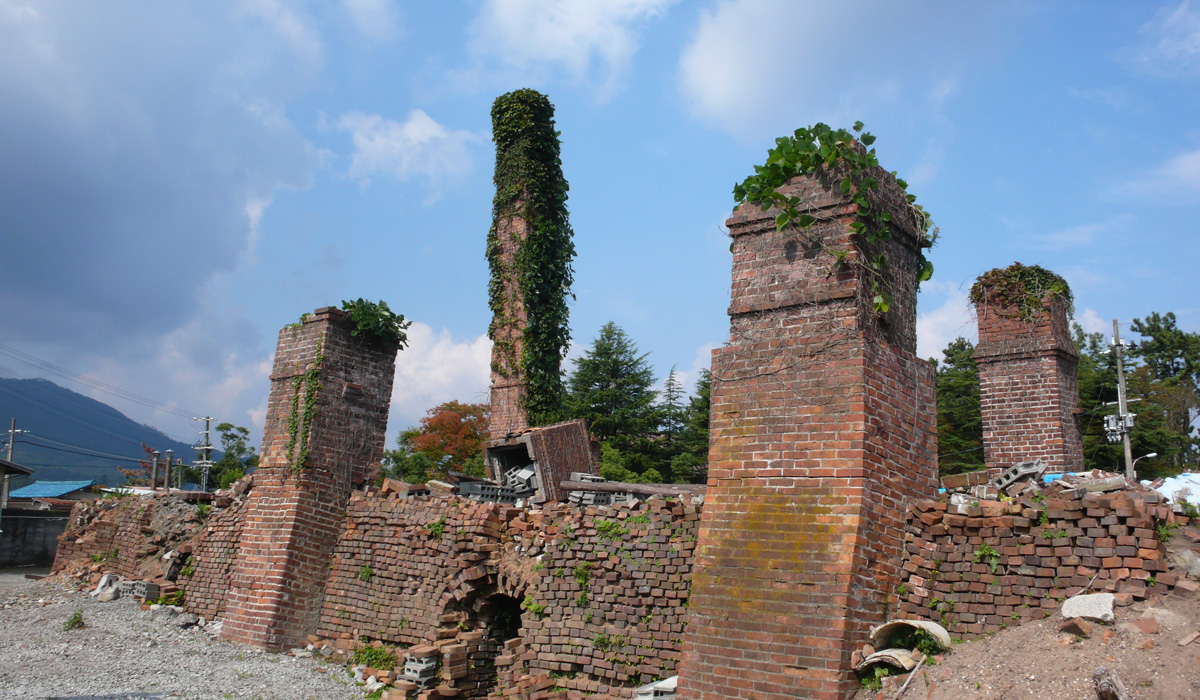 犬島精練所美術館・カラミ煉瓦 所在地:岡山県岡山市東区犬島327-4撮影年:2023年 [No053 エイジング/煉瓦] 銅を作るときに出る不要物 「カラミ」を 直方体などに成形した 「カラミ煉瓦」の遺構がアートとして…