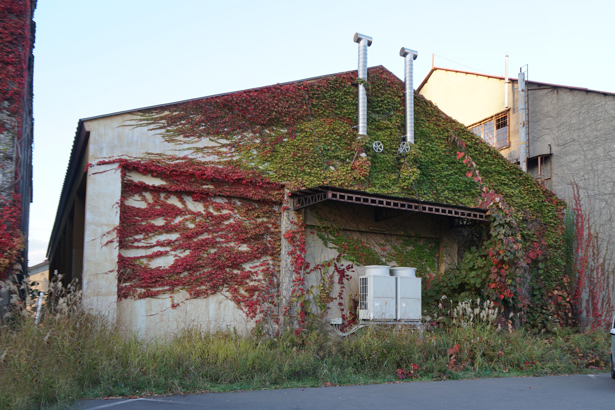 門構えのオフィスビル 所在地:長野県長野市南千歳1撮影年:2023年、2003年 [No055 エイジング/その他] 1963年竣工。建築家林雅子初期の代表作品の打放しコンクリートが植物(蔦)で覆われている。