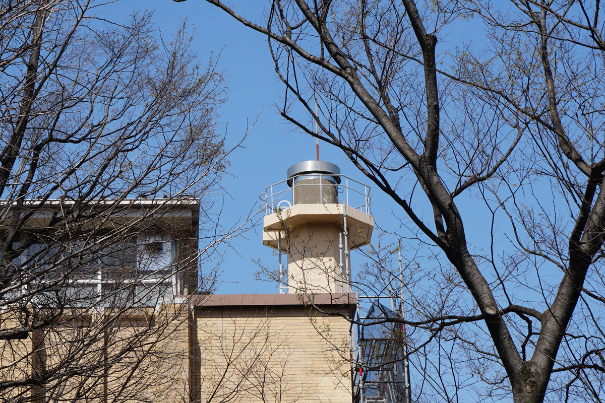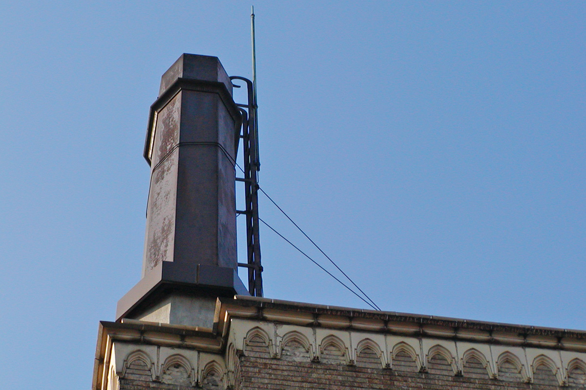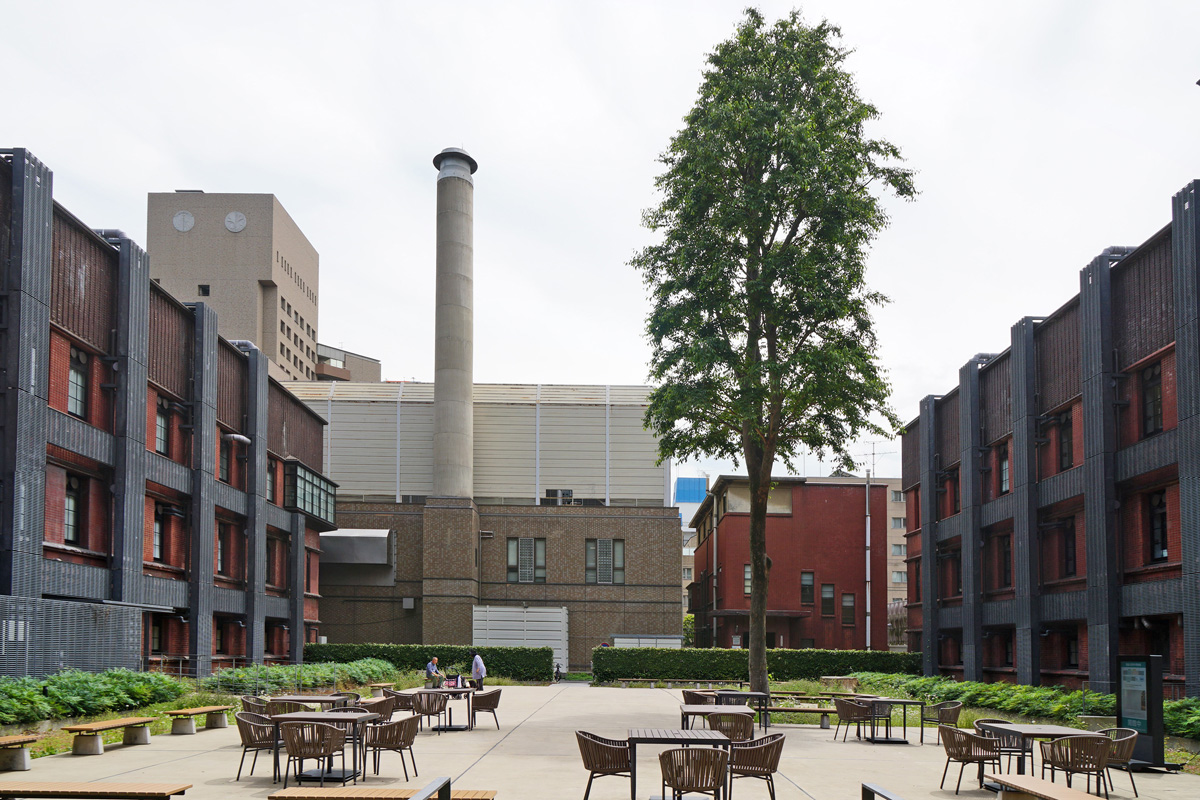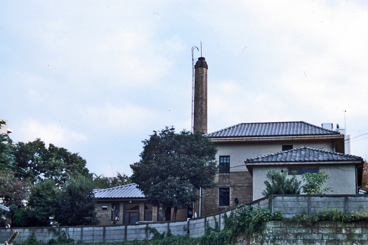 [No192 煙突/ビル] 建物と同様に赤色二丁掛タイルが貼られ窓上下のリブもあり建物と一体となった煙突。設計はスイス人建築家マッ…