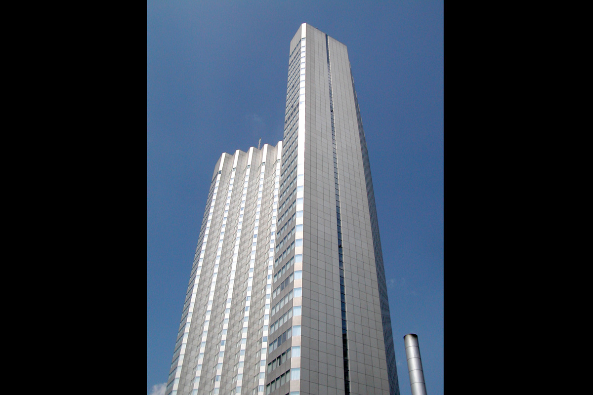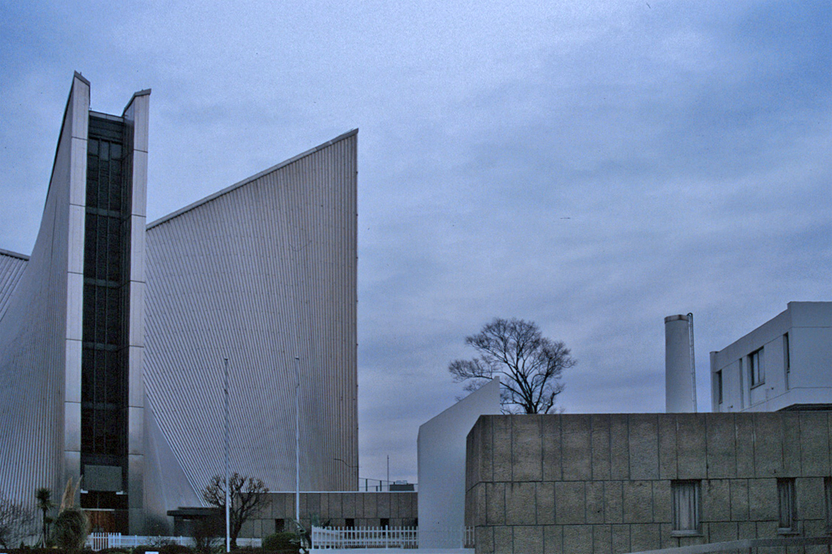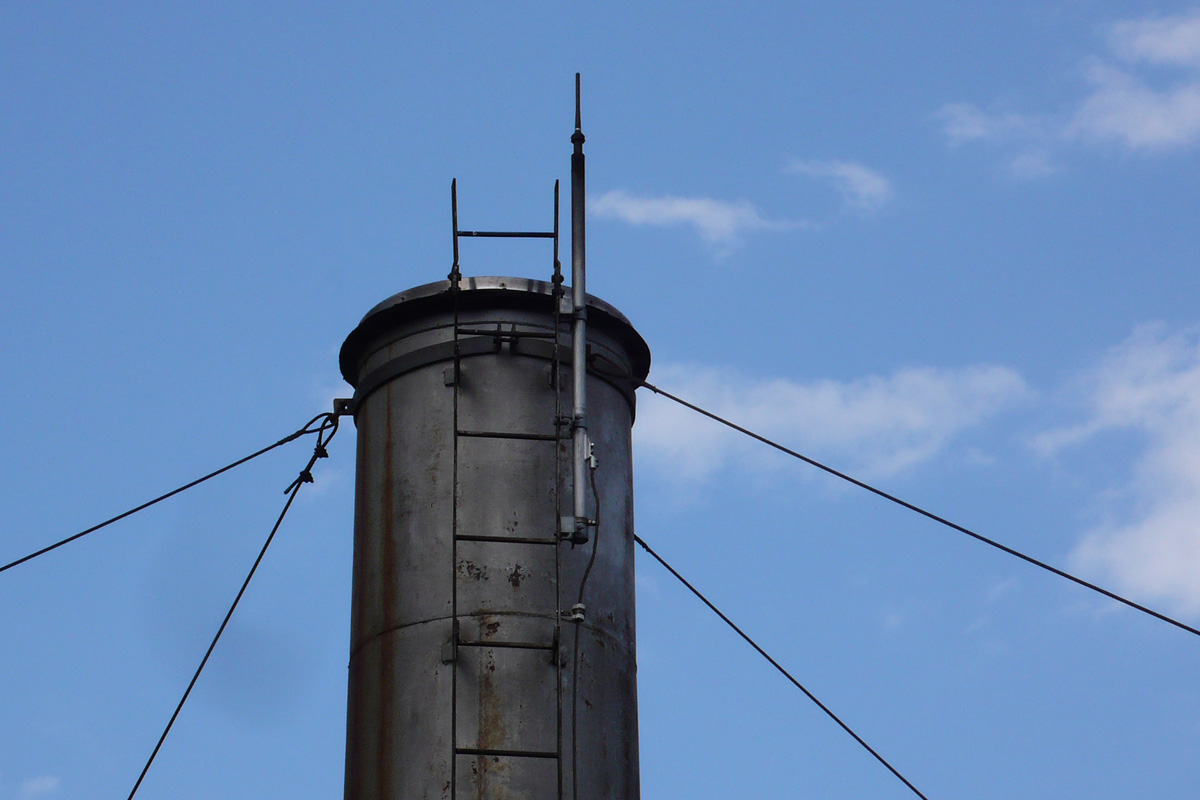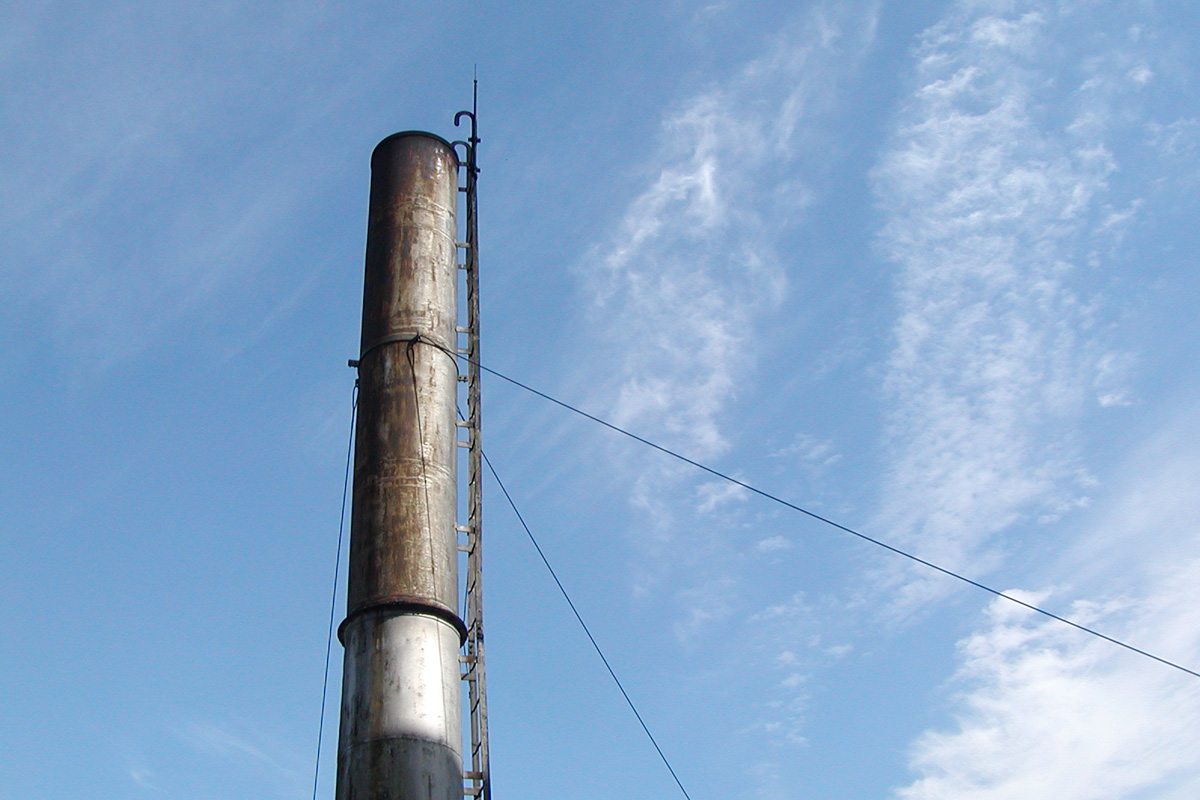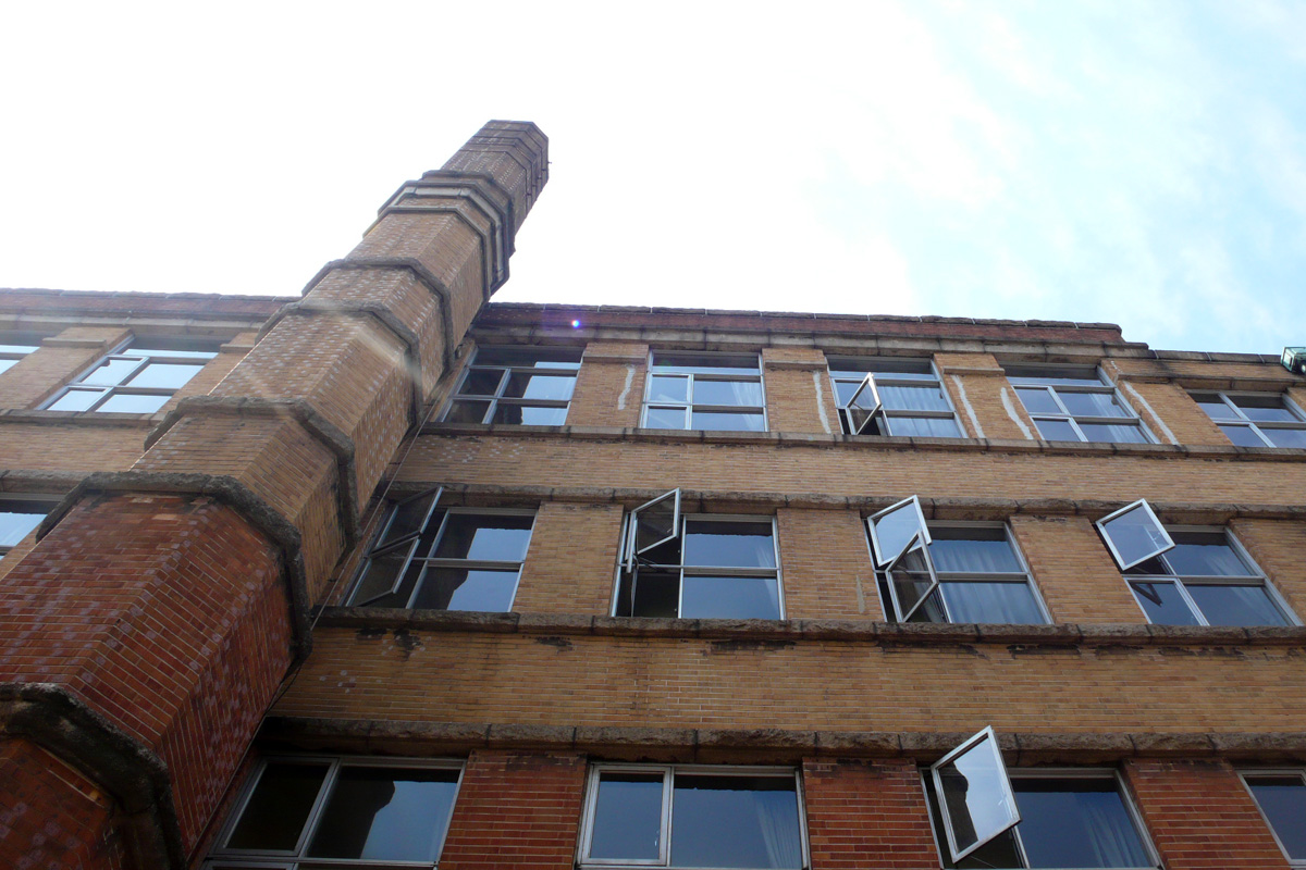 [No192 煙突/ビル] 建物と同様に赤色二丁掛タイルが貼られ窓上下のリブもあり建物と一体となった煙突。設計はスイス人建築家マッ…
