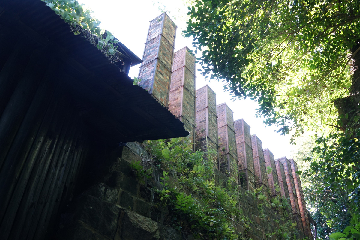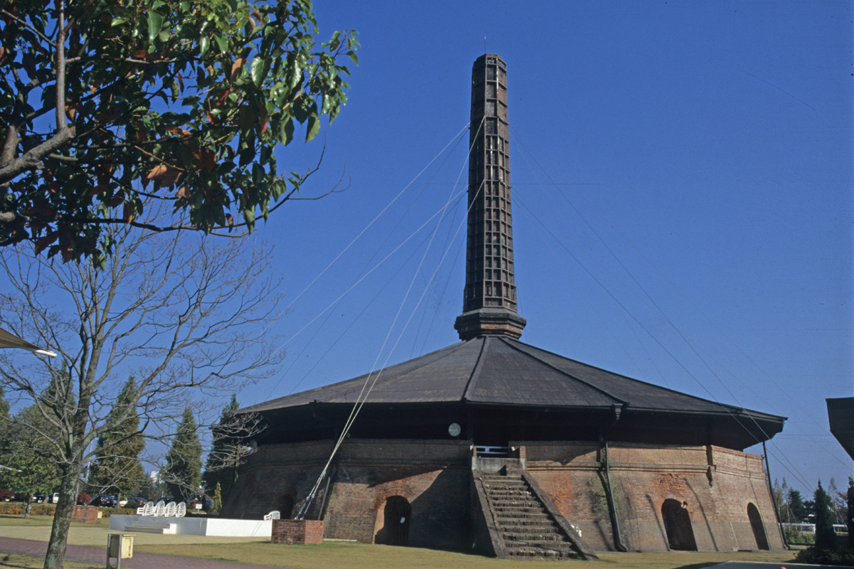 ホフマン式輪窯(野木町煉瓦窯) 所在地:栃木県下都賀郡野木町大字野木3324-10撮影年:1999年 [No178 煙突/その他] 円弧状に並べられた16の窯で連続的に煉瓦を製造したホフマン式と呼ばれる窯