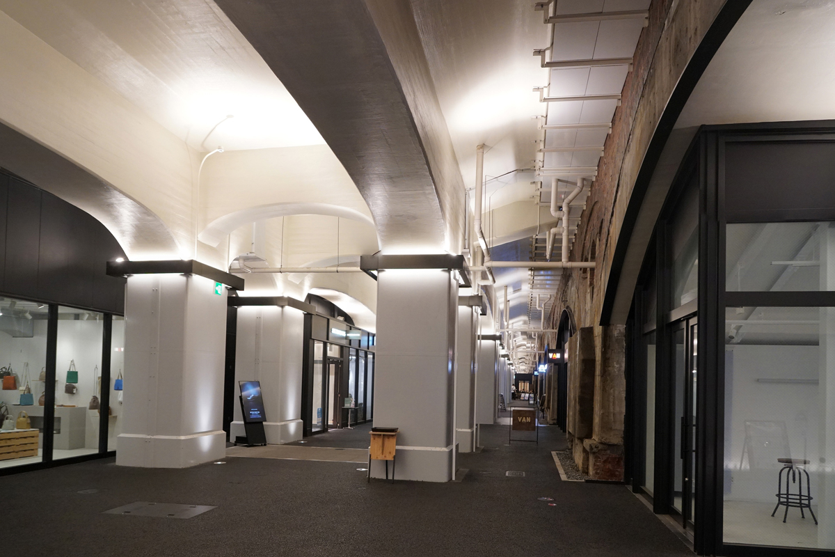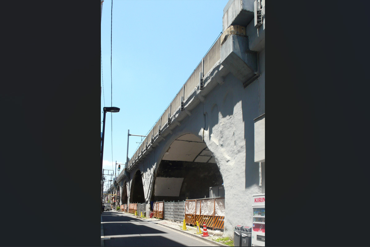 日比谷OKUROJI 所在地:東京都千代田区内幸町1-7-1撮影年:2022年、2023年 [No130 鉄道/高架] 建設時代が異なる組積煉瓦造の高架と鉄筋コンクリートの高架の個性を対比させ、高架橋下を魅力的な路地商業施…